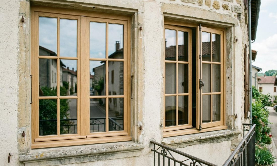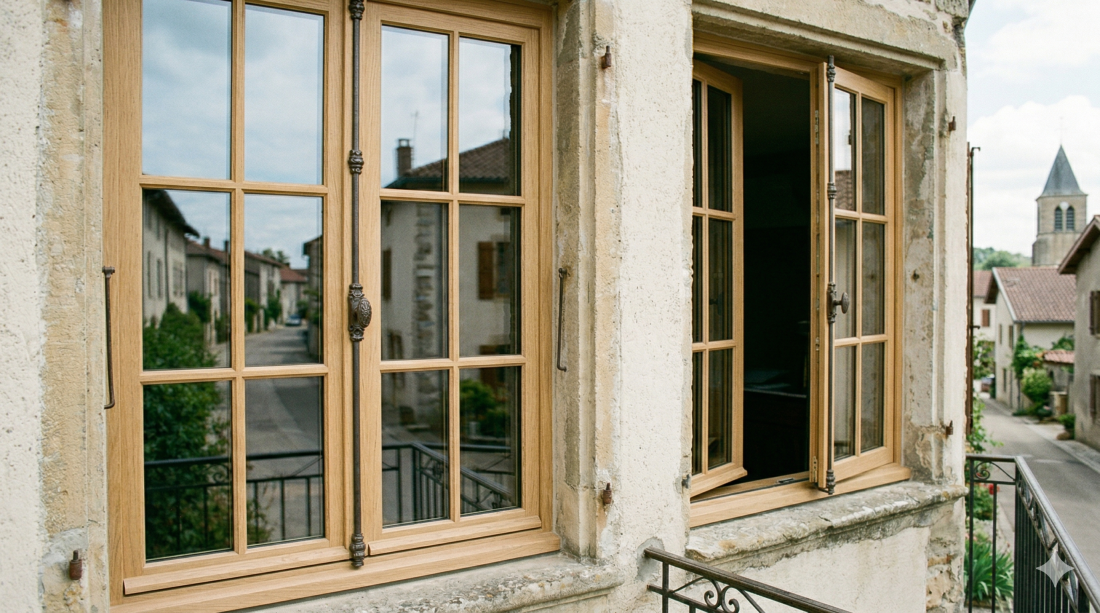Remplacement de fenêtres sur-mesure en chêne massif à Jonage : finition lasurée chêne clair, croisillons traditionnels, crémones Vieux Fer et double vitrage ITR pour une isolation et un cachet authentique.